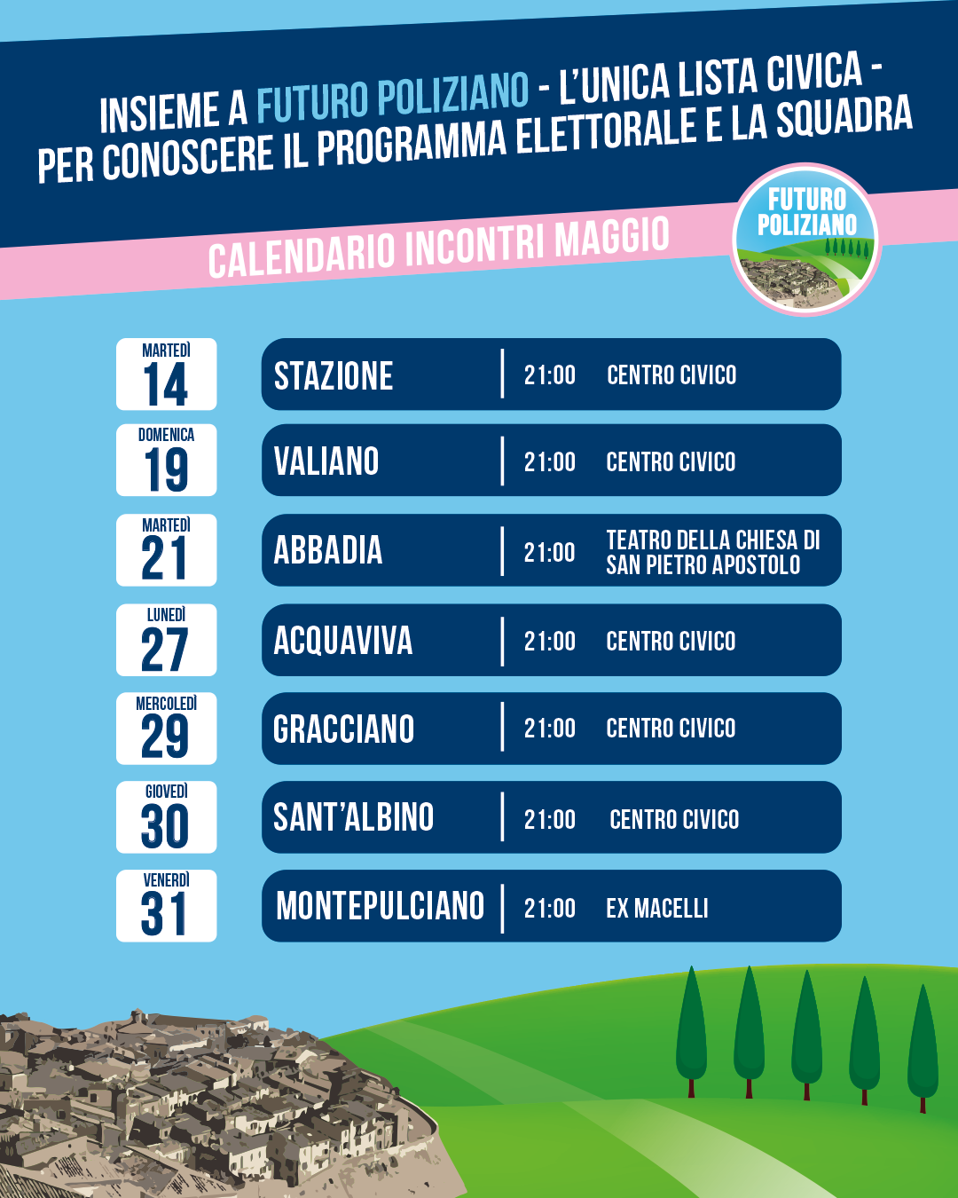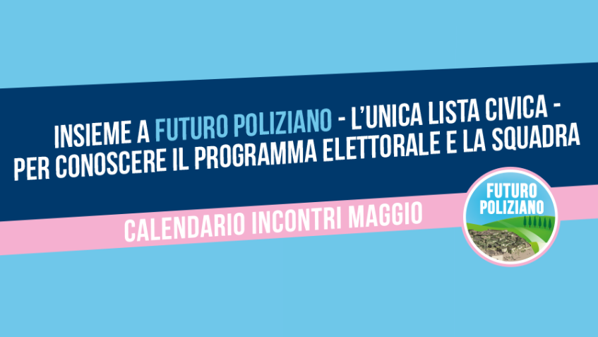 Insieme a Futuro Poliziano – l’unica lista civica – gli incontri di maggio con la cittadinanza per conoscere il programma elettorale e la squadra.